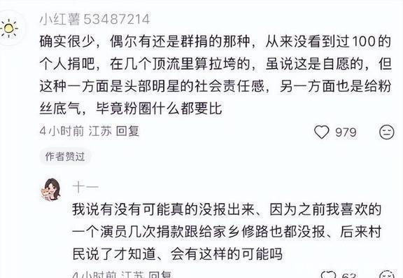 有网友还专门去翻了翻她以前的捐款记录,发现她好像一直都不太热衷这个事儿。每次明星们集体晒捐款的时候,她总是安安静静的,跟隐身了一样。