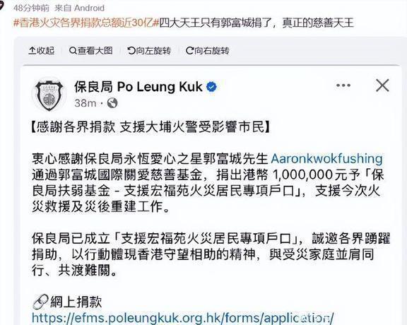 香港那场大火之后啊,网上真是一片唏嘘,大家心里都不好受。社会上各个圈子的人也都挺给力,纷纷掏钱帮忙,七凑八凑的,捐款总数居然到了三十多个亿,真是不少了。